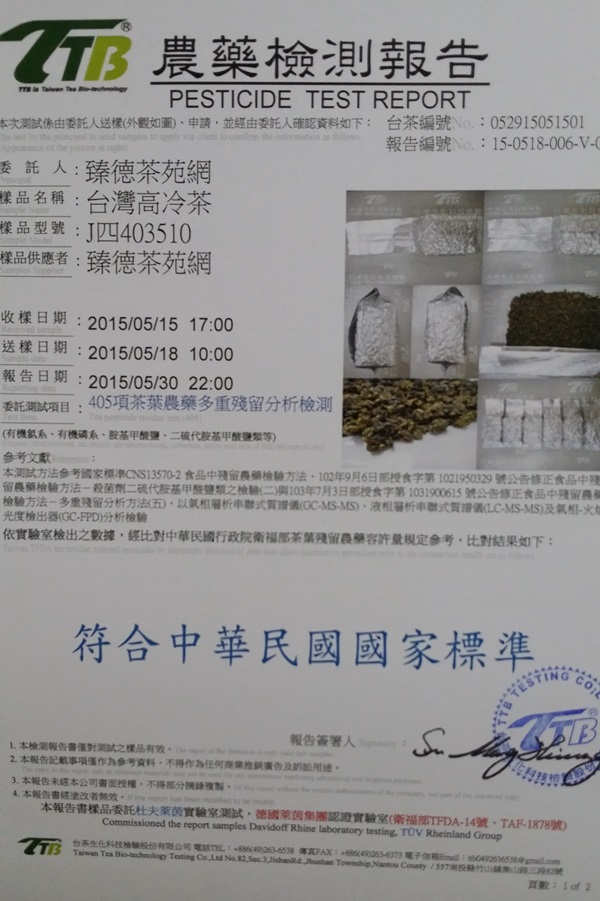 為了讓更多茶友能喝得安心 !買的安心!我們將逐步做到, 每版茶葉做檢驗,臻德用心,請您放心!藥檢合格證書
